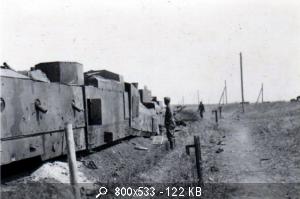 Советский бронепоезд «За Родину!», разбитый немецкой авиацией в районе Ворошиловграда (ныне город Луганск). Южный фронт. Передняя бронеплощадка имеет три башни — от танка КВ-2, от танка Т-34 (но перевооруженная 45-мм пушкой) и башня с 76-мм полевой пушкой образца 1902 г.13 июля 1942 года совместно с другим бронепоездом сдерживал атаки немцев в районе станции Родаково. На 61 км разъезда Родаково-Меловая 15 июля 1942 года подвергся трем налетам авиации. В третьем налете участвовало 30 бомбардировщиков. Взрывами бомб разбило и сбросило с полотна зенитную платформу и платформу с тяжелой пушкой, разбило тендер бронепаровоза. В ночь на 16 июля уцелевшие бойцы команды бронепоезда сняли вооружение и ушли в сторону станции Меловой.